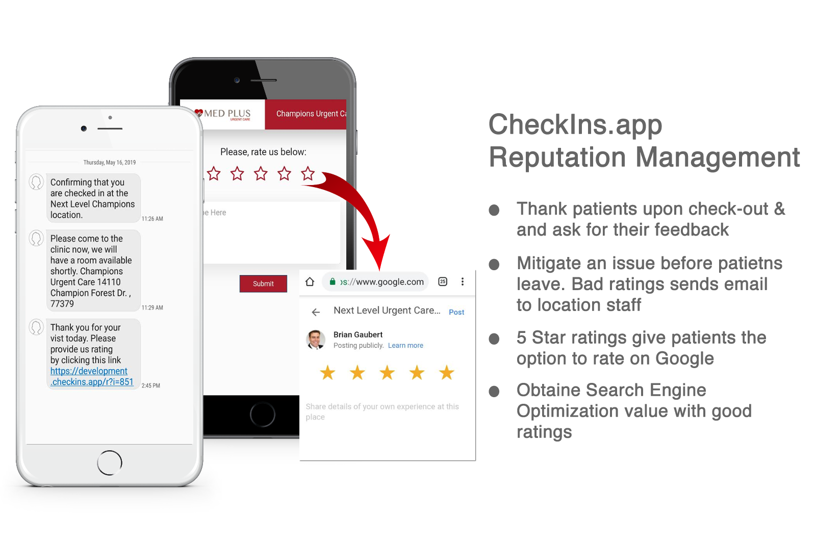 If the patient rates the experience with only 1-2 stars, immediately the CheckIns.app system notifies your onsite staff of the low rating while the client is still in the urgent care center. Staff can immediately speak with the patient face to face to resolve the situation before the patient leaves your care center. This additional notification feature for 1-2 star ratings is designed to help reduce negative ratings and improve your overall client experience.